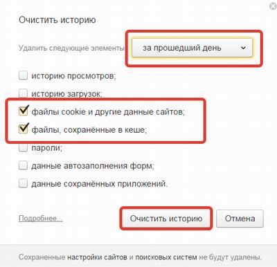 - Укажите галочками, что удалить: файлы cookie и файлы, сохраненные в кеше (историю просмотров и историю загрузок, равно как и пароли с другими данными удалять не требуется)