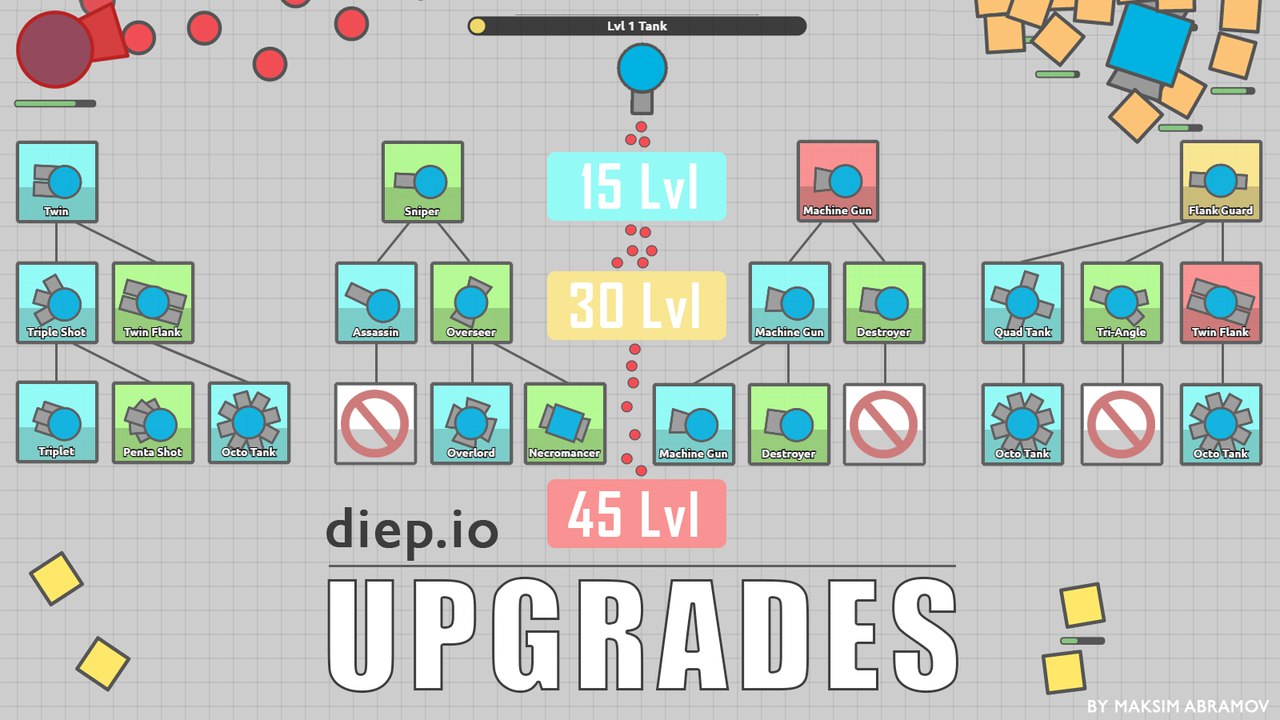 Прокачки и скины в игре Дип ио плотно связаны друг с другом. Дело в том, что чем лучше прокачан ваш танк, тем деловитее он выглядит. Чуть ниже вы можете ознакомиться с веткой развития прокачки танков в Diep io. Прокачивать танк вы можете, убивая врагов, а новые скины можно получить бесплатно, прорекламировав игру у себя на страничке в Фейсбук или Твиттере.