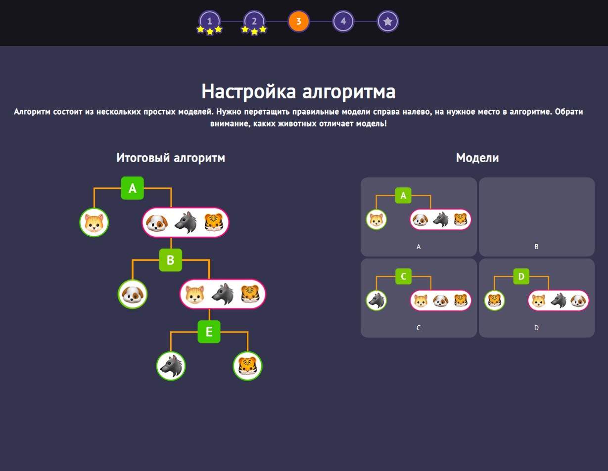 После предыдущих этапов обучения стоит скомпоновать (сложить) все ранее полученные знания. Итак, финальная настройка алгоритма, чтобы робот мог различать всех животных между собой сразу. Правильный ответ под буквой В, поскольку мы сначала должны отделить собаку от кота/волка и тигра. Ответ А не подходит по причине банального повтора картинки-алгоритма; ответ С неверный, так как мы отделяем волка, а он должен остаться в ответе С; ответ D неверный, так как мы отделяем тигра, а он должен остаться в ответе Е. На этом все обучение заканчивается.