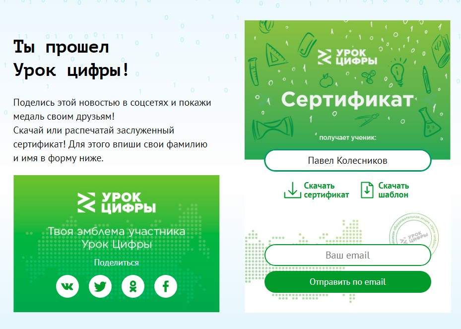 В конце прохождения урока каждый сможет получить сертификат об успешном прохождении. Впишите свое имя и поделитесь им в социальных сетях, чтобы все знали, какой вы умный!