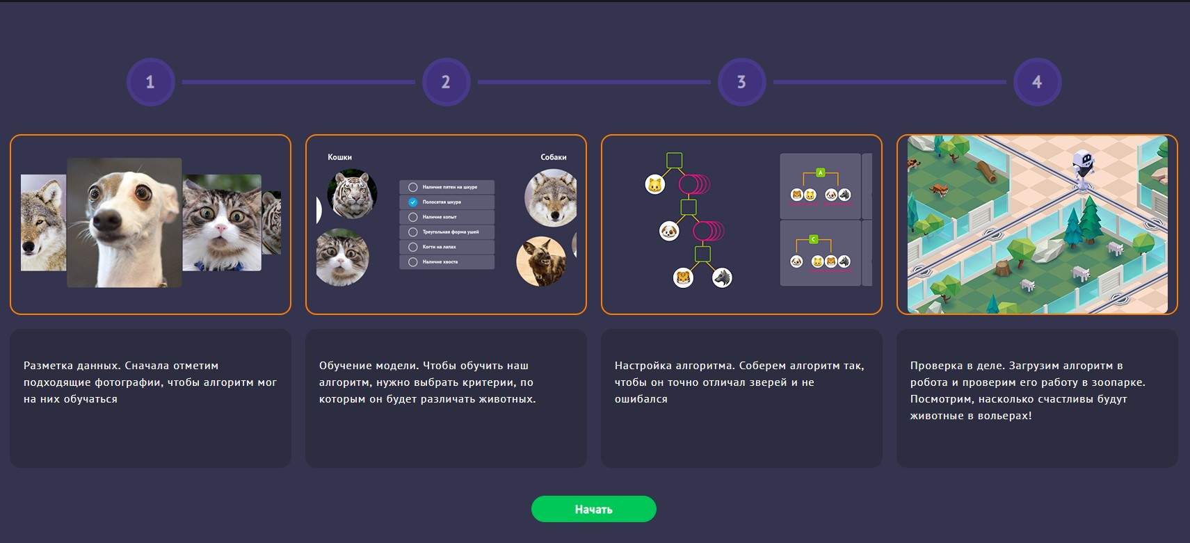 Как мы уже сказали, ученикам начальных классов предстоит наладить работу зоопарка, где за животными присматривают роботы. Суть заключается в том, чтобы обучить роботов различать животных (кошек, собак, волков, тигров). Это необходимо для того, чтобы роботы впоследствии смогли правильно подбирать корм для животных. Если сделать это неправильно, то собакам достанется корм для котов и наоборот, от чего животные останутся голодными и недовольными. Но не волнуйтесь, мы поможем вам правильно обучить роботов, чтобы все зверье осталось сытым!