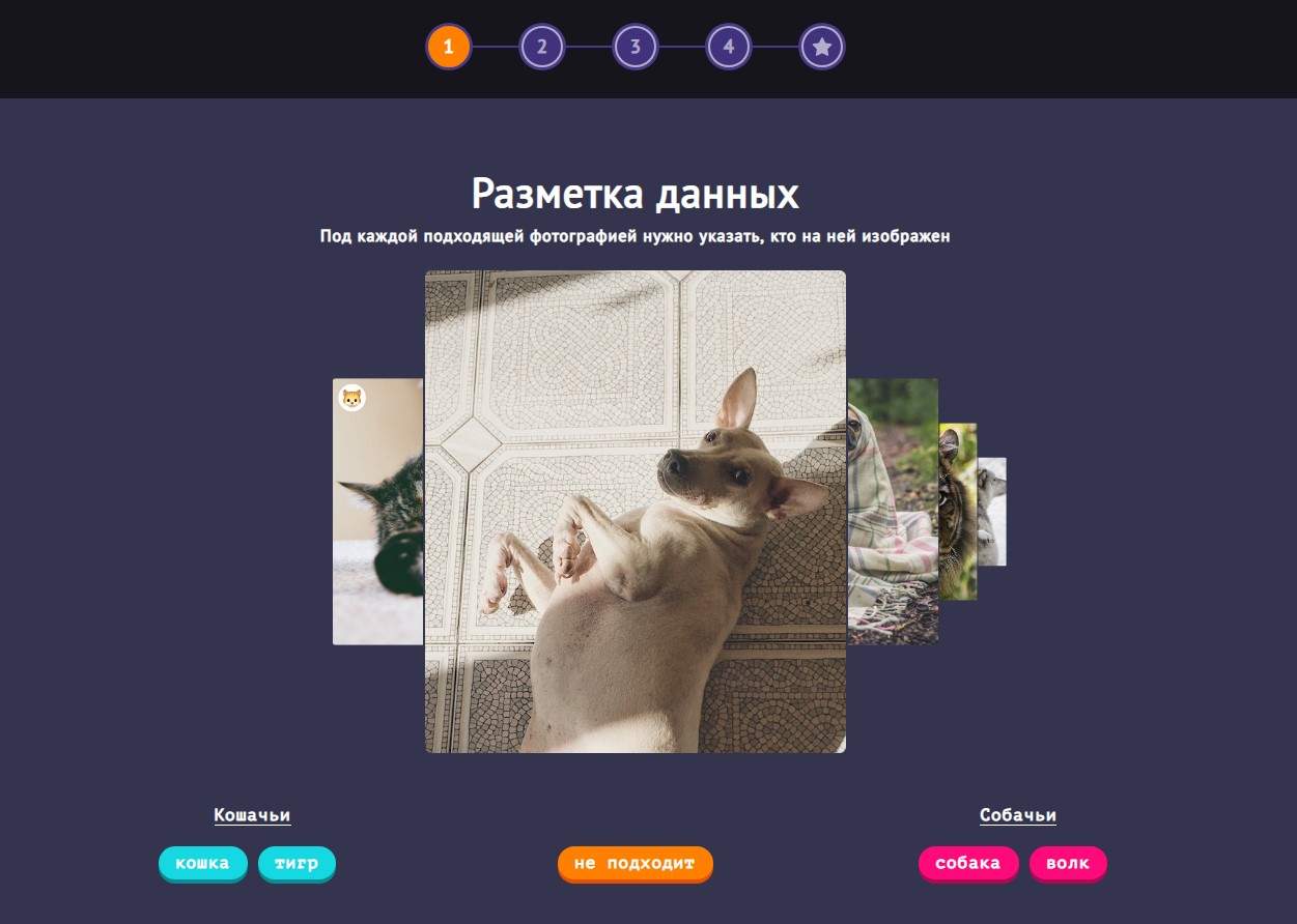 Сначала нас встречает некий профессор, который дает нам задачу обучить робота различать животных для последующего правильного подбора корма для них. Для того, чтобы заполнить базу данных робота правильными категориями, потребуется просмотреть несколько фотографий с различными животными. Есть четыре типа: собаки, коты, тигры и волки. При просмотре фотографий необходимо кликать на соответствующие кнопки с названиями животных в зависимости от того, кто изображен: если волк, то жмем красную кнопку "волк", если тигр, то синюю кнопку "тигр" и т.д. Если на фото изображено неподходящее животное, которого нет в списке, то жмем жёлтую кнопку "не подходит" - все очень просто.