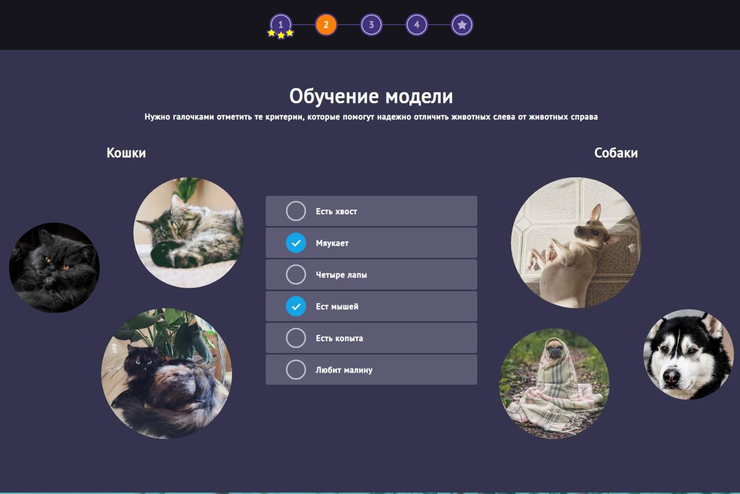После того, как мы отсортировали фото согласно имеющемуся зверью, нужно обучить робота отличать животных друг от друга согласно их особенностей. Для начала нам предлагают выбрать критерии, по которым кошки отличаются от собак (что есть у одних и отсутствует у других). Взять кошку: она мяукает (собака так не умеет, она гавкает) и есть мышей (собака есть косточки). Готово!