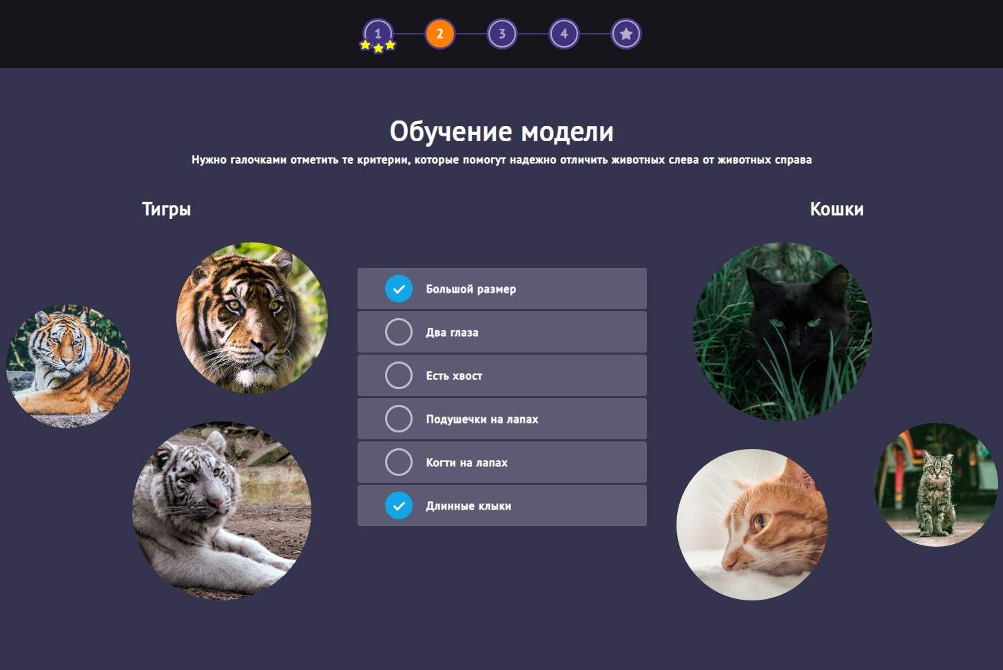 Чтобы отличить тигров от кошек, необходимо выбрать пункты Большой размер и Длинные клыки, ведь тиграм присущи эти критерии, а кошкам нет (они маленькие и клыки у них также крохотные).