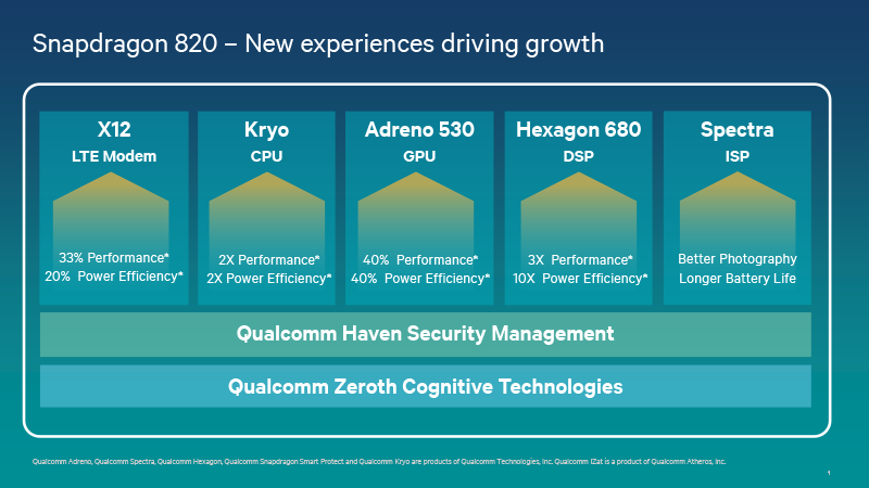 Snapdragon 820 (MSM8996), изготовленный по 14-нм техпроцессу FinFET (транзисторы с 3D-затворами), базируется на 64-битных кастомных ядрах Kryo с частотой до 2,2 ГГц. В помощь к четырем ядрам подключаются: графика Adreno 530 с поддержкой библиотек OpenGL ES 3.1+AEP, Renderscript, OpenCL 2.0 и API Vulcan, IPS-сопроцессор Spectra, Hexagon 680 DSP и модем X12 LTE.