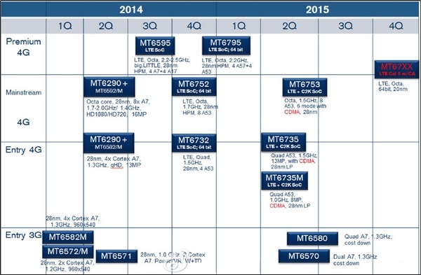 Тоже должны появится в районе второго квартала 2015 года. Видимо, они будут предназначены для смартфонов нижнего ценового сегмента. Похоже, что, в отличие от остальных, технологию LTE MT6570 и MT6580 поддерживать не будут. Кроме того, MT6570 будет наделён всего лишь 2-мя ядрами Cortex A-7 и работать на тактовой частоте 1,3 ГГц. MT6580 будет 4-ядерным с такой же частотой.