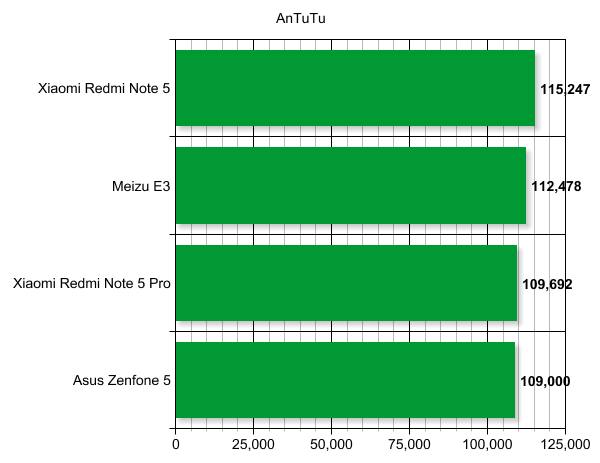Благодаря ядрам Kryo 260, основанным на Cortex-A73 и графическому процессору Adreno 509, протестированные аппараты преодолевают психологическую отметку в 100 тысяч баллов по AnTuTu. Это отличные результаты для смартфонов средней ценовой категории, ведь буквально в 2016 году мы наблюдали похожие цифры только у флагманских чипов 800 серии. Минимальные баллы получил Asus Zenfone 5 с 4 ГБ оперативной памяти - 109 тысяч баллов. Ну а максимальные Redmi Note 5, на борту которого оказалось 6 ГБ ОЗУ - 115 247 баллов.