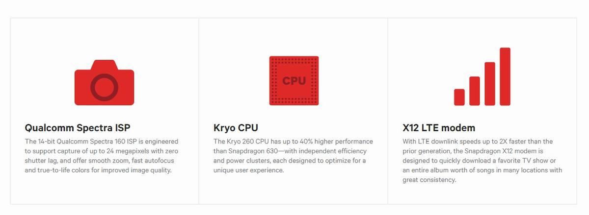 • Процессорный блок (CPU): 4 высокопроизводительных ядра Kryo 260 с частотой 1,8 ГГц (кастомные Cortex-A73) + 4 энергоэффективных ядра Kryo 260 с частотой 1,6 ГГц (кастомные Cortex-A53)