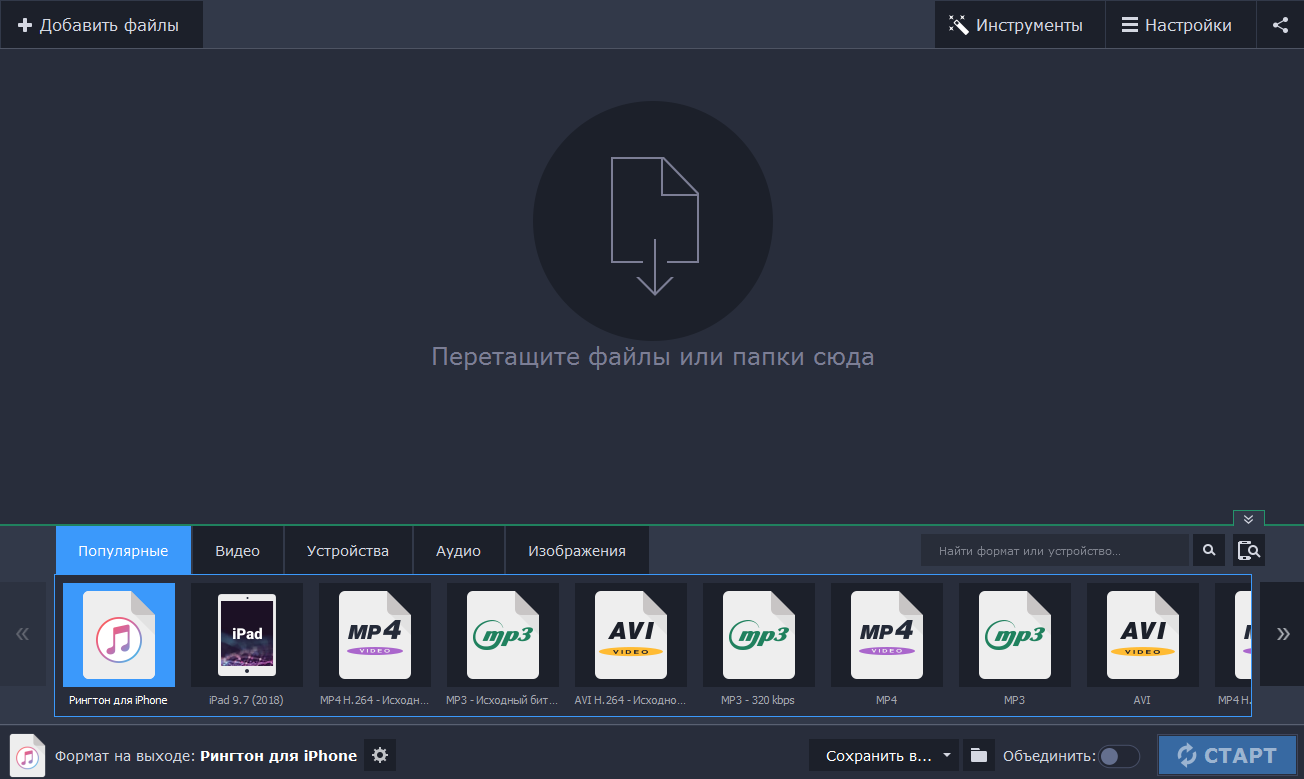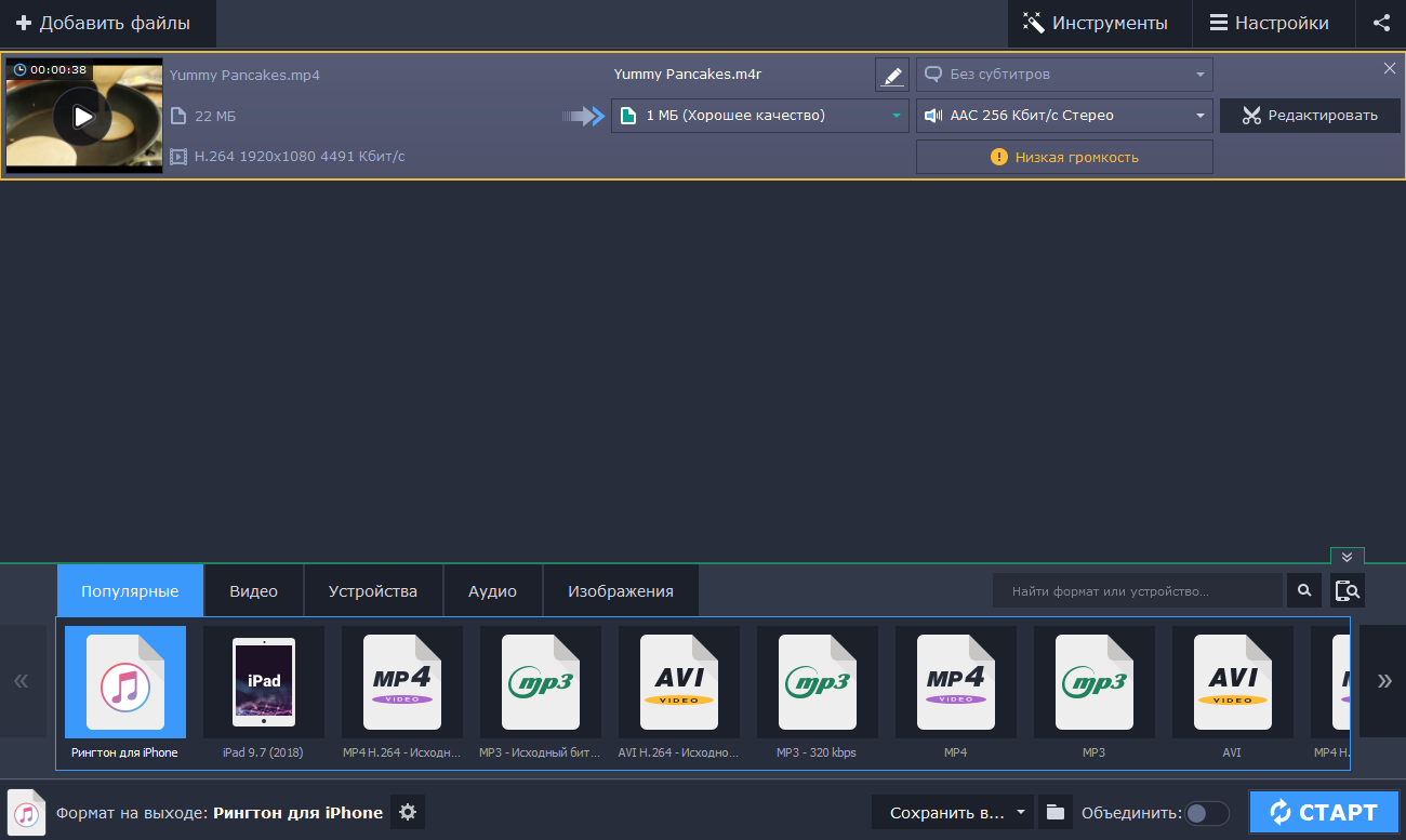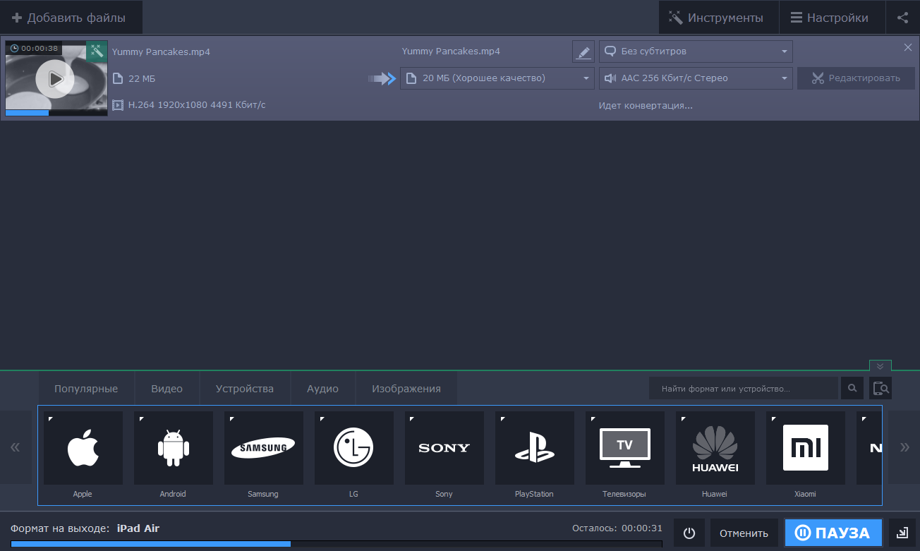 - Автоматически подбирать формат видеофайла для телевизоров, планшетов, смартфонов;