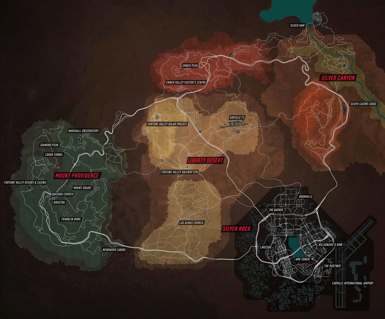 • Либерти-Дезерт – из названия несложно понять, что это пустыня. Находится она недалеко от города Сильвер-Рок. В этой локации вас ждет пыль, бездорожье и пробитые шины. Ключевые места: аэродром, солнечный проект и две станции.