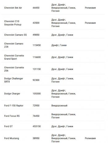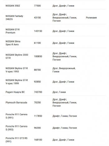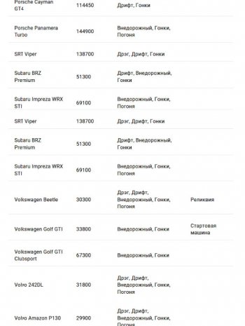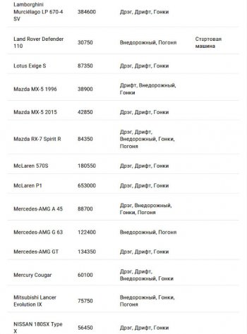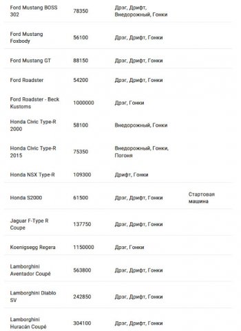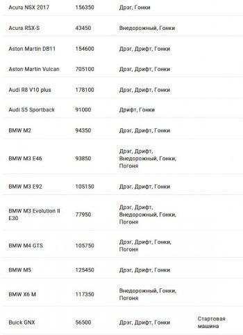 В Need for Speed Payback 2017 игроку на выбор доступно 74 машины. Обычно в этой серии игр присутствуют только гоночные машины, но в Need for Speed Payback 2017 нашлось место внедорожникам и олдскульным машинам. Все машины в Need for Speed Payback 2017 разделены на классы. Всего в игре их пять: дрэг, дрифт, внедорожный, гонки, погоня. Если ваша машина не имеет способности к дрифту, то её использовать для этого вида заездов вы не можете. Получается, что в вашем гараже в Need for Speed Payback 2017 должно находится сразу несколько машин. Кстати, в Need for Speed Payback 2017 машины стоят очень дорого, поэтому даже после полного прохождения игры вы вряд ли сможете открыть абсолютно все модели. Ниже мы предлагаем вам ознакомиться с полным списком машин Need for Speed Payback 2017 и с их стоимостью.