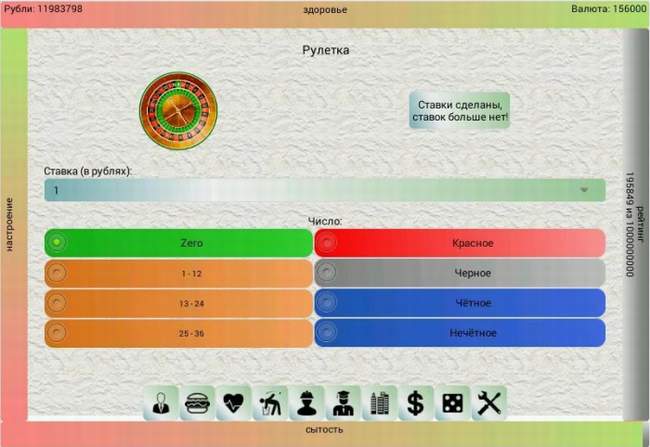 В игре множество интересностей, к примеру,  игра на акциях или Рулетка.