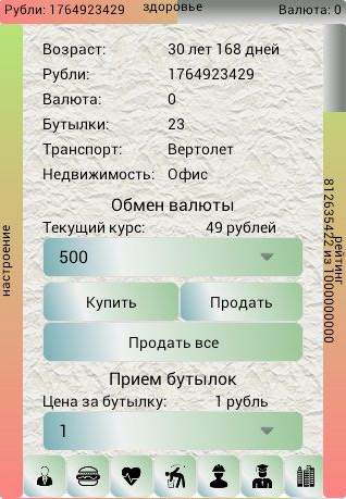 Достигнуть максимального рейтинга можно, увеличив свое благосостояние в процессе прохождения игры Бомжара. Как только вы запустили игру, не нажимайте кнопку «начать», а сперва зайдите в ее «настройки» и введите количество денежек в начале игрового процесса. Максимальное значение – пятьдесят тысяч рублей. Затем заходите в игру. Здесь вам 18 лет и почему работать вы не можете. Нужно исправить данную ситуацию. Для этого следует зайти в «образование» и выучить табличку умножения. Затем отправляетесь в меню «транспорт» и приобретите кроссовки. Все, школу можно заканчивать. Денег после окончания школы у вас уменьшится. Должно остаться на счету 42850 рублей. Следует приобрести палатку (сделать это можно в меню «недвижимость»). И принимается за работу (в соответствующем меню выбираем пунктик «мести дворы»). И не задавайтесь постоянно вопросом «Как пройти Бомжару?», лучше следите за показателями индикаторов. Покупки следует делать в магазине (тут неплохо затариться коньяком), лечиться нужно в хорошей клинике. Когда немного заработаете деньжат, купите велосипед и отправляйтесь на учебу в ПТУ. Дворы мести не прекращайте до тех пор, пока не соберете 15 тысяч рублей. Теперь можно и комнату снять. Как только вы это сделаете, сможете работать на заводе или сантехником. Когда соберете миллион рублей, половину суммы нужно обменять на доллары. Дальше нужно приобрести ВАЗ и закончить институт. Комнату можно уже не снимать. Следует взять ипотечный кредит и устроиться на работу в офисе. Работать нужно до тех пор, пока не заработаете пятьдесят миллионов. Это хватит для покупки крутого автомобиля. Далее меняйте деньги на доллары до тех пор, пока не накопите миллион у.е. Теперь вам нужно отправиться за границу и отучиться в Оксфорде. Затем насобирайте денег на свою квартиру (весьма важный момент для Бомжа) и отправляйтесь работать на биржу. Заработки там неплохие (200000 р/д). С таким доходом вы сможете купить что угодно, хоть вертолет.