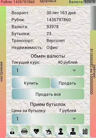 Рейтинг растет, когда Бомж пьет алкоголь, и уменьшается, когда он роется в помойке, побирается. На начальном этапе нужно забыть о горячительных напитках. Нужно набирать необходимую репутацию для получения новой профессии и увеличения доходов. Как только перейдете на здоровое питания (а доходы будут уже хорошие», нужно выбрать опцию «тусня в клубе» за тысячу рублей. Так вы сможете получить высокий рейтинг и при этом сохранить здоровье.