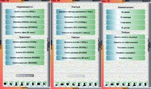 Да-а, прикольная игра... Вначале было тяжело, из помойки не вылезал, пока не отучился в школе, а там легче стало. Когда копил на ПТУ, вдруг подфартило - выиграл млн рублей в лотерею! Сразу отучился в ВУЗе, квартира по ипотеке и поехало. Еще нашел один