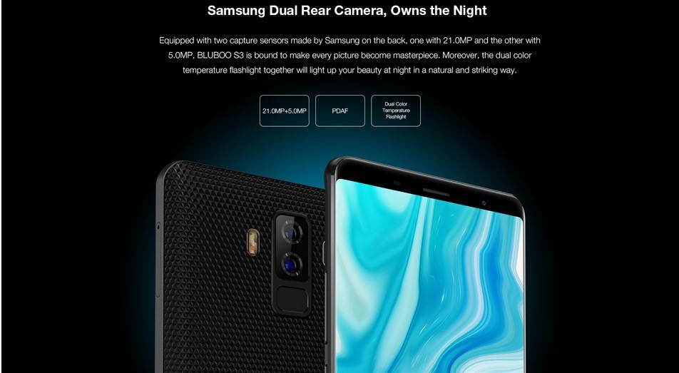 Двойные камеры сегодня уже обыденность, но в то же время видеть в Bluboo S3 связку из 21 МП + 5 МП очень приятно. Однако автофокус и все плюшки получила 21 МП камера, а вот 5 МП упрощена до того, что у нее фиксированный фокус. Тем не менее это позволяет девайсу делать хорошие фото и качественные снимки с эффектом боке. Оба сенсора произведены компанией Samsung, поэтому в их качестве не стоит даже сомневаться. Что касается передней камеры, то ее разрешение составляет 13 МП и она также изготовлена компанией Samsung.