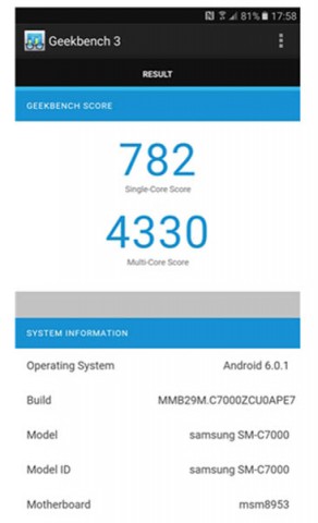 Как уже было сказано, новая модель процессора Qualcomm Snapdragon 625 способна выдавать отличные результаты в синтетических тестерах, взять тот же Антуту-бенчмарк. Еще до выхода Galaxy C7, его результаты производительности утекли в сеть, где он демонстрировал все те же 60 000+ очков, чего должно с головой хватить для современного мира и мобильных игрушек. Новая оболочка TouchWiz более легкая и не такая нагруженная ненужными программами, поэтому телефон будет шустро переключаться по меню и быстро запускать программы, и игры. Учитывая целых 4 ГБ ОЗУ на борту, можно с уверенностью сказать, что тормозить, зависать или вылетать (из-за нехватки ОЗУ) ничего не будет, причем еще не один год. Для сравнения, похожей мощностью обладает Mediatek Helio X10 (стоит в Xiaomi Redmi Note 3).