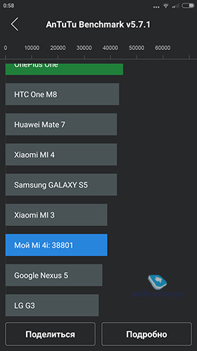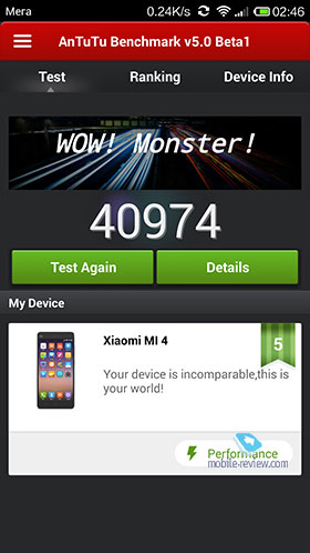 На сегодняшний день производительности абсолютно всех модификаций Xiaomi Mi4 хватит для комфортного пользования смартфоном без тормозов и подлагиваний, быстрого открытия приложений и игр. Согласно оценкам популярного синтетического тестера Антуту, можно сделать вывод, что мощность Mi4 и Mi4i находится на примерно одинаковом уровне (около 40 000 очков), в то время как Mi4c и Mi4S демонстрируют более высокие, схожие результаты между собой в районе 65 000 баллов. Это значит, что производительности более старых Mi4 и Mi4i уже не хватит для высоких настроек прожорливых игр, хотя на средних поиграть получится без проблем, а вот на Mi4c и Mi4S можно запустить абсолютно все, что душе угодно и никаких проседаний фпс быть не должно.