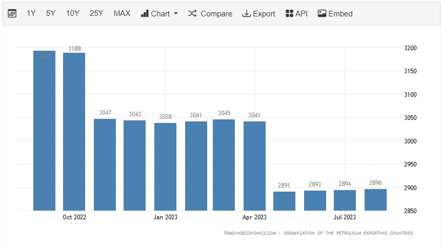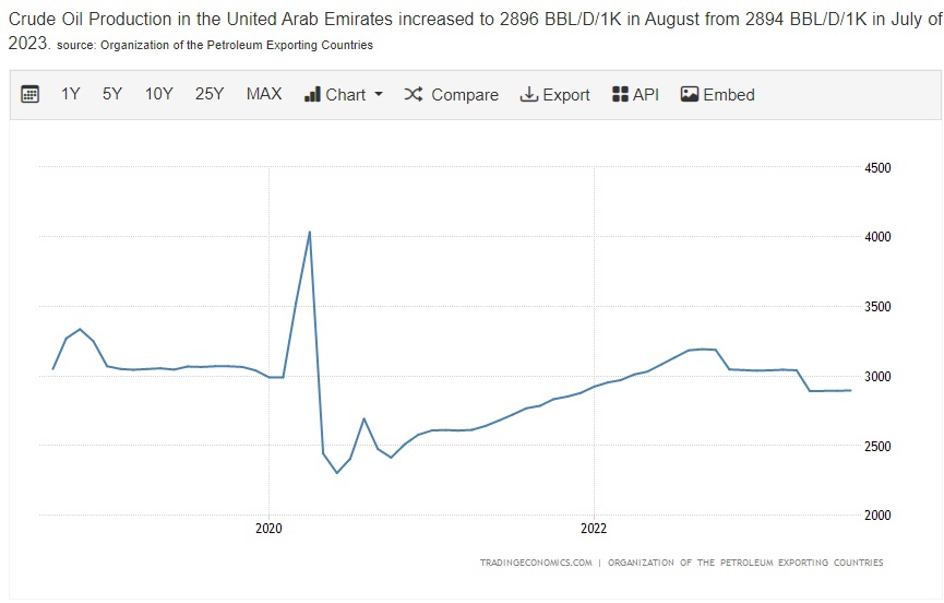 Более того, наращивание объёмов добычи, длившееся с 2020 по 2022 год сейчас прекращено и за последний год было два крупных сокращения объёмов: в ноябре 2022 и в мае 2023. В августе 2023 объём составил 2,896 миллиона баррелей в сутки. Если такой уровень добычи сохранится, то он составит около 145 миллионов тонн сырой нефти в год. Это уже выводит ОАЭ из десятки крупнейших экспортёров нефти в мире: страну обгоняет санкционный Иран, Бразилия и даже Кувейт.
